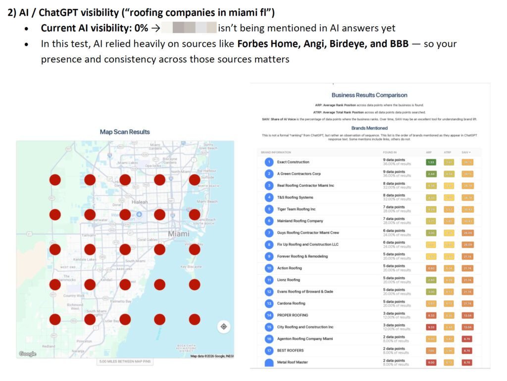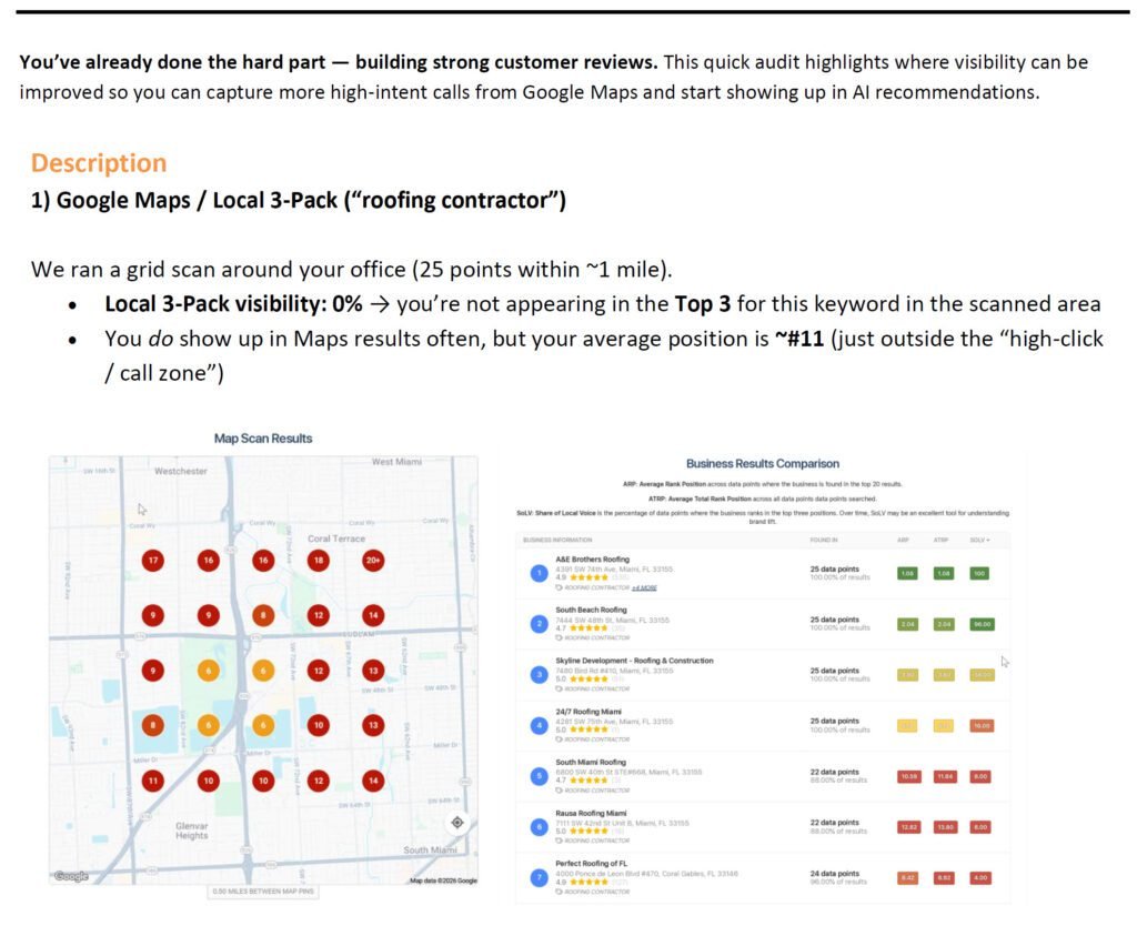 If this sample audit was helpful, we can perform a custom visibility check for your business ($250 Value) and share a simple 1-page action plan focused on:
